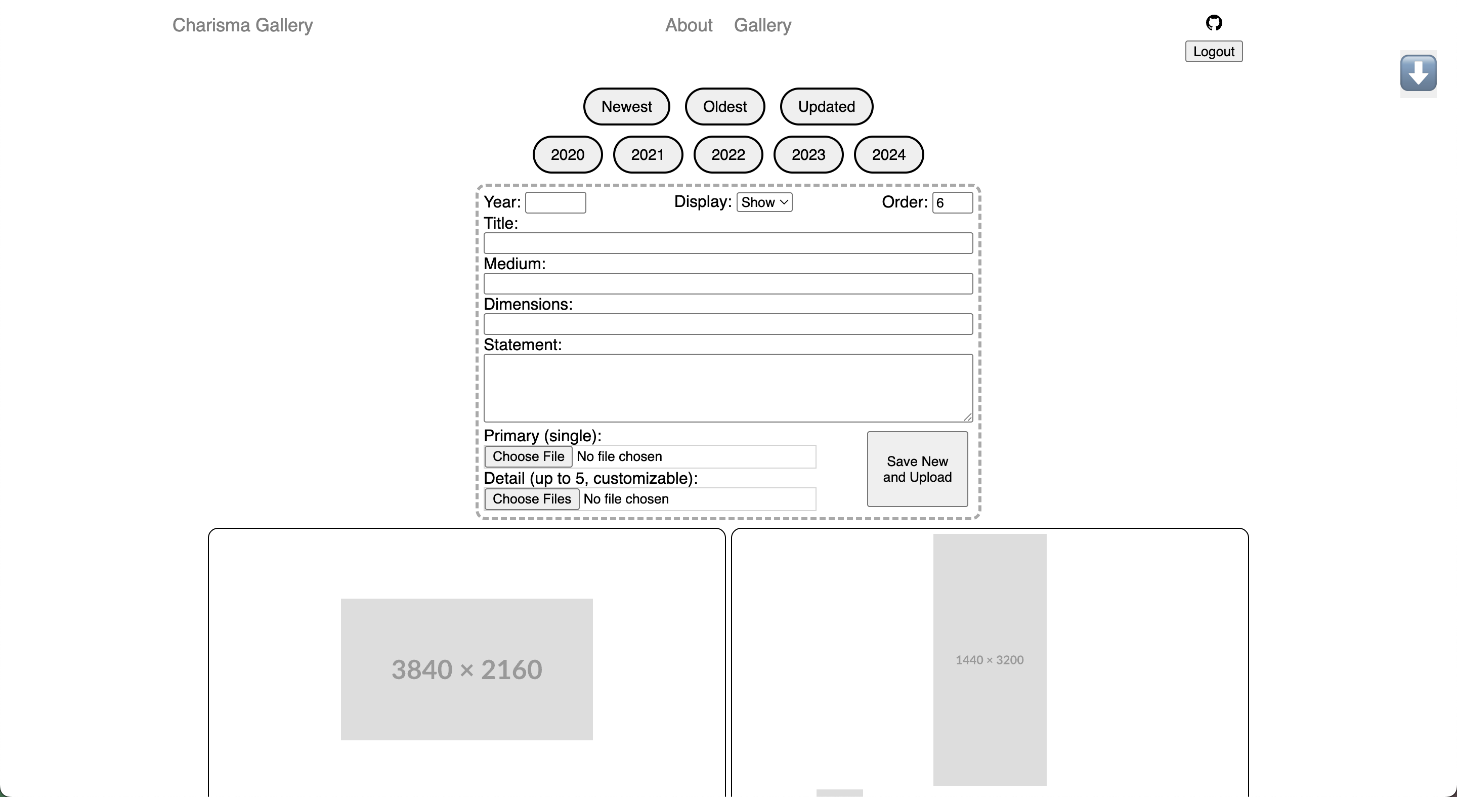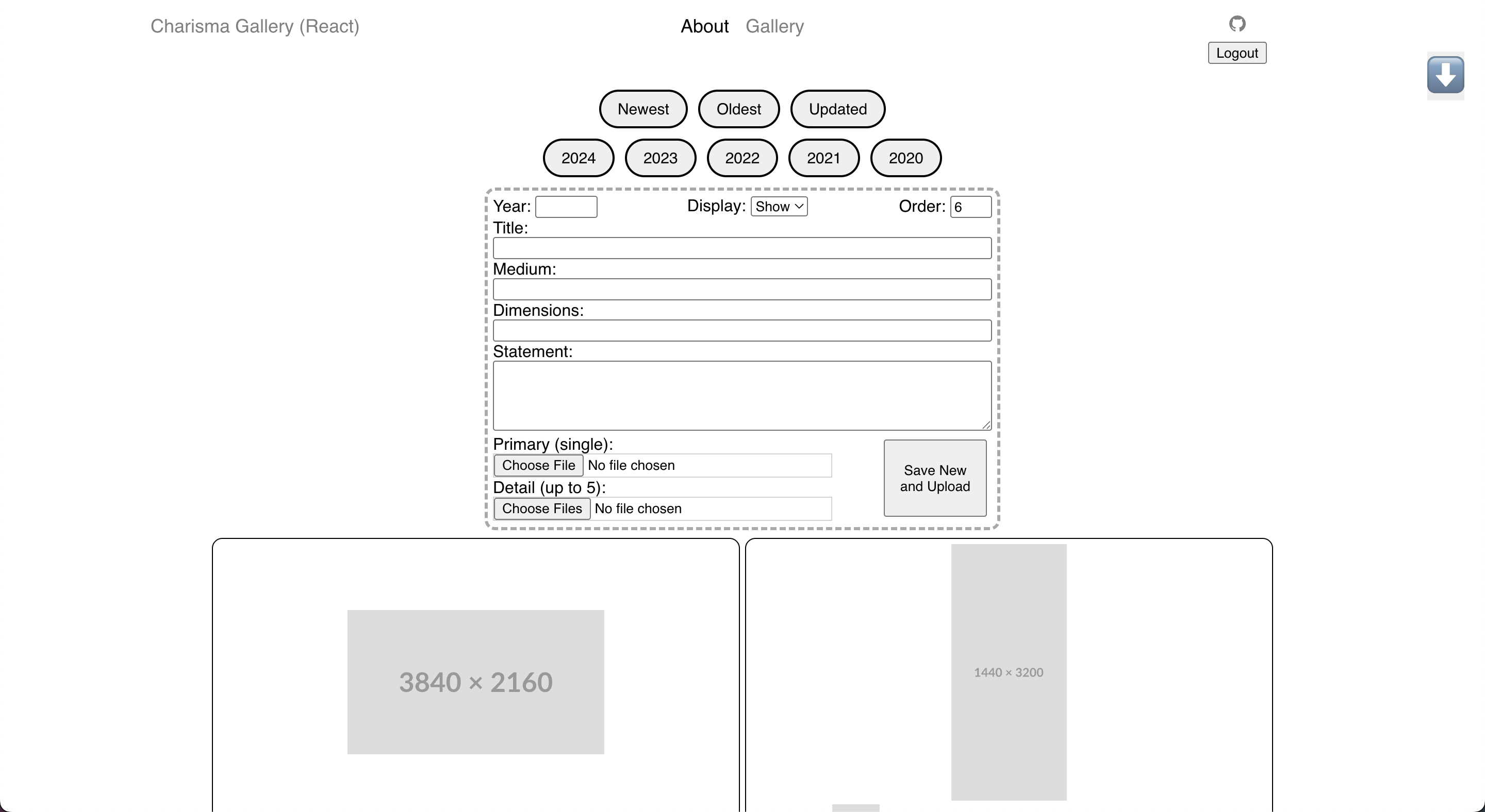 Make sure to visit the Charisma Gallery (in React!) Demo to experience all that it has to offer, including the vistor-facing and administrative-facing views! As before, this Demo is styled as minimalistic as possible. Keep in mind that all colors, positioning, and data can be configurable upon deployment (by me) to truly make your gallery one-of-a-kind!